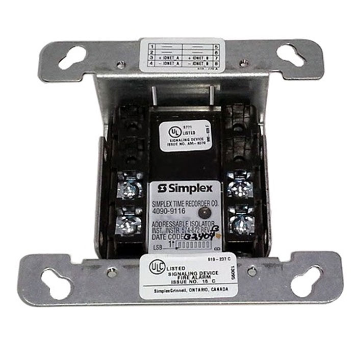 Addressable IDNet Communications Isolators provide IDNet communications isolation to improve installation convenience and increase system integrity. Isolation is automatically activated when an output short circuit is detected and isolation can also be selected manually from the control panel to assist with troubleshooting wiring problems.